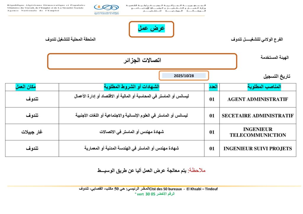 تعلن مؤسسة اتصالات الجزائر بولاية تندوف عن توفر مناصب عمل شاغرة في التخصصات التالية: