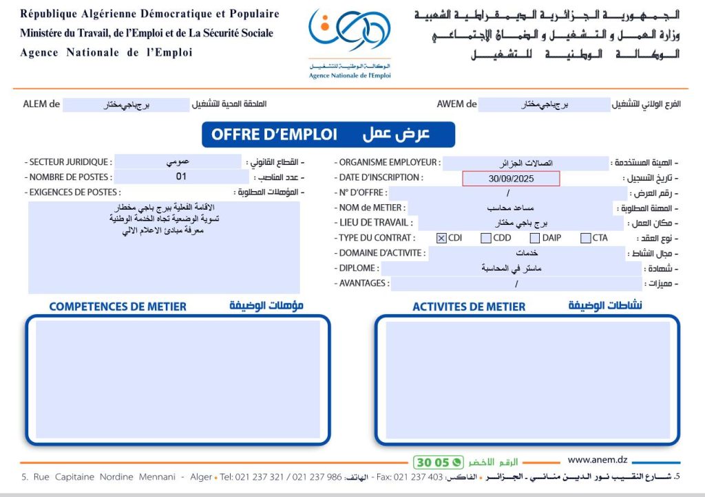 مساعد محاسب ماستر في المحاسبة CDI الإقامة الفعلية ببرج باجي مختار، تسوية الوضعية تجاه الخدمة الوطنية، معرفة مبادئ الإعلام الآلي