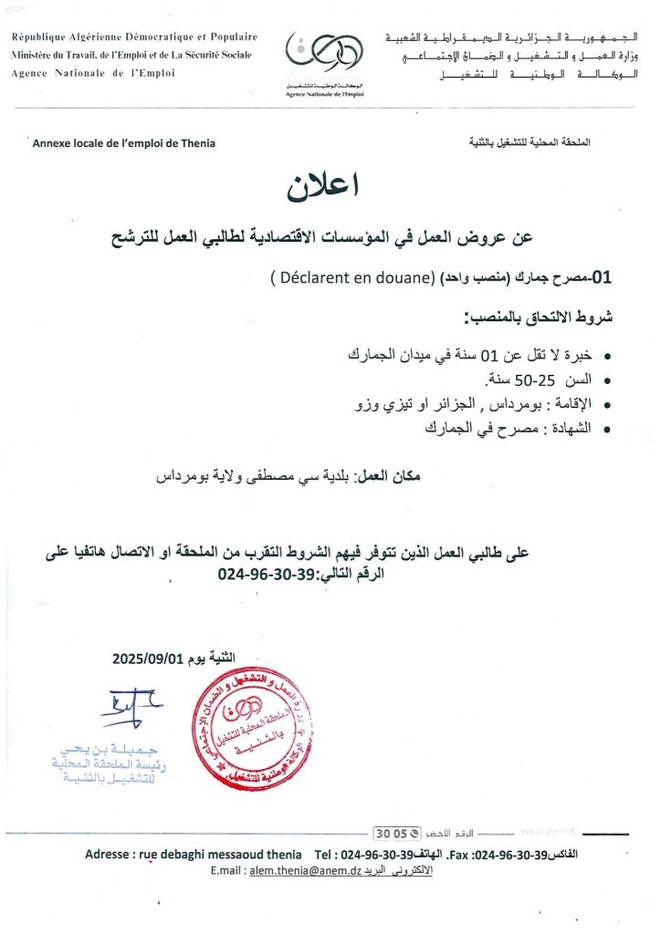 على طالبي العمل الذين تتوفر فيهم الشروط التقرب من الملحقة أو الاتصال هاتفيا على الرقم التالي: 024-96-30-39