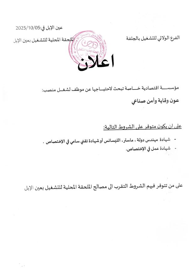 تعلن مؤسسة اقتصادية خاصة عن رغبتها في توظيف عون وقاية وأمن صناعي، وذلك لتغطية احتياجاتها في هذا المجال.