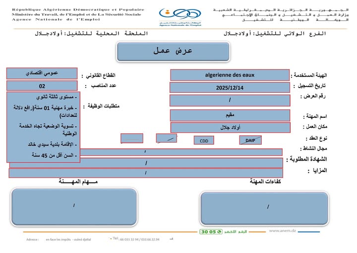 الهيئة المستخدمة: الجزائرية للمياه (Algérienne des Eaux)