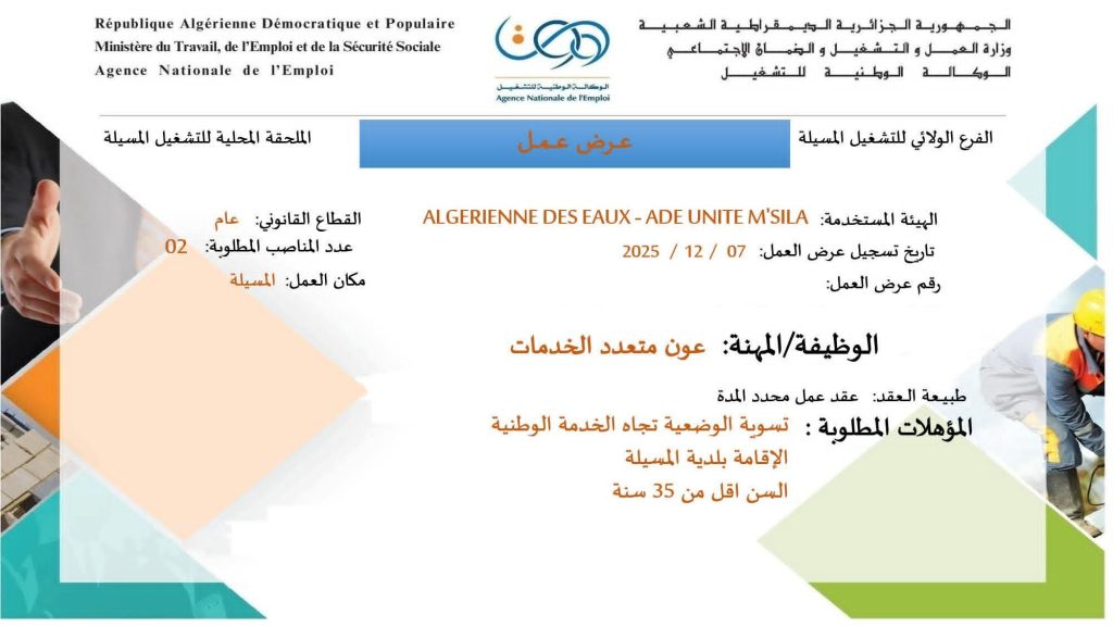 هيئة المستخدمة: ALGERIENNE DES EAUX – ADE UNITE M’SILA
