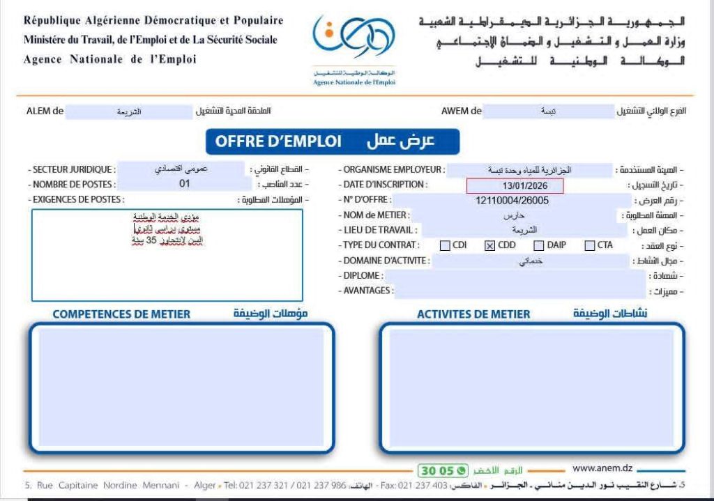الهيئة المستخدمة: الجزائرية للمياه وحدة تبسة