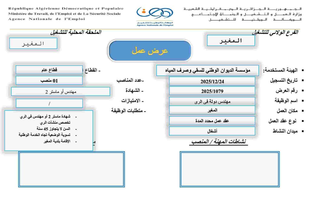 | مهندس دولة في الري | 2025/1079 | 01 منصب | مهندس أو ماستر 2 | المغير | شهادة ماستر 2 أو مهندس في الري (تخصص منشآت الري) + الإقامة ببلدية المغير |