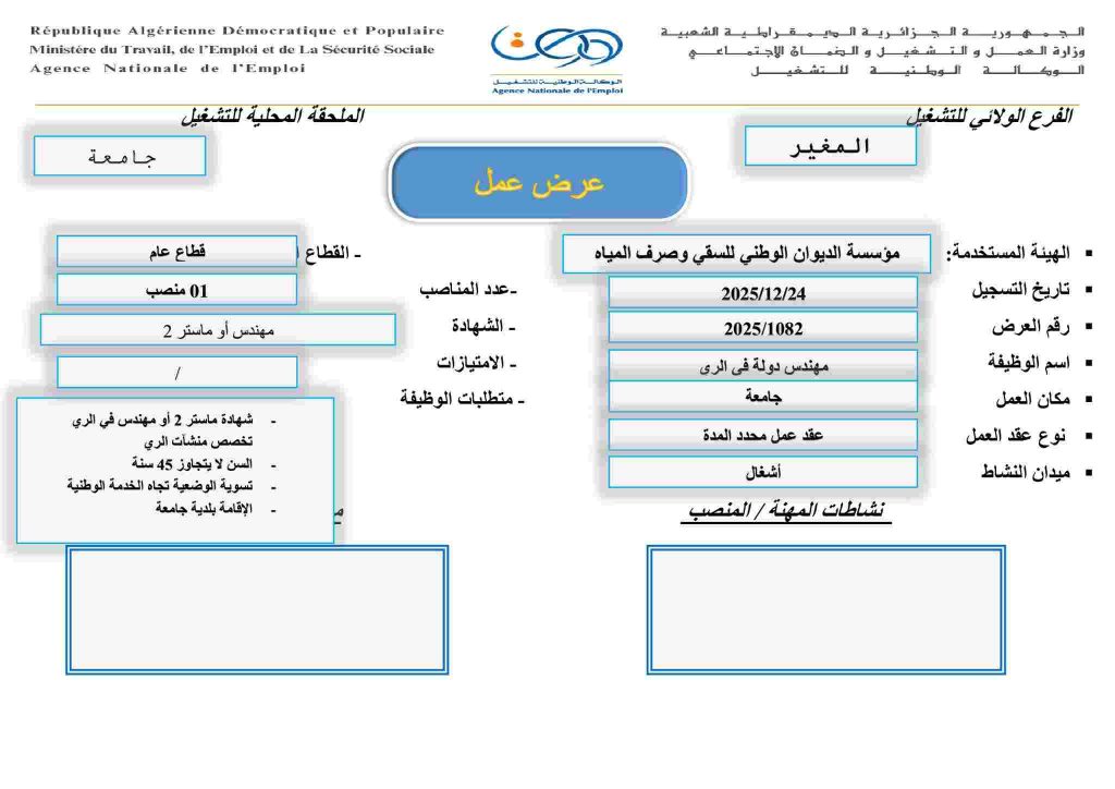 | مهندس دولة في الري | 2025/1082 | 01 منصب | مهندس أو ماستر 2 | جامعة | شهادة ماستر 2 أو مهندس في الري (تخصص منشآت الري) + الإقامة ببلدية جامعة |