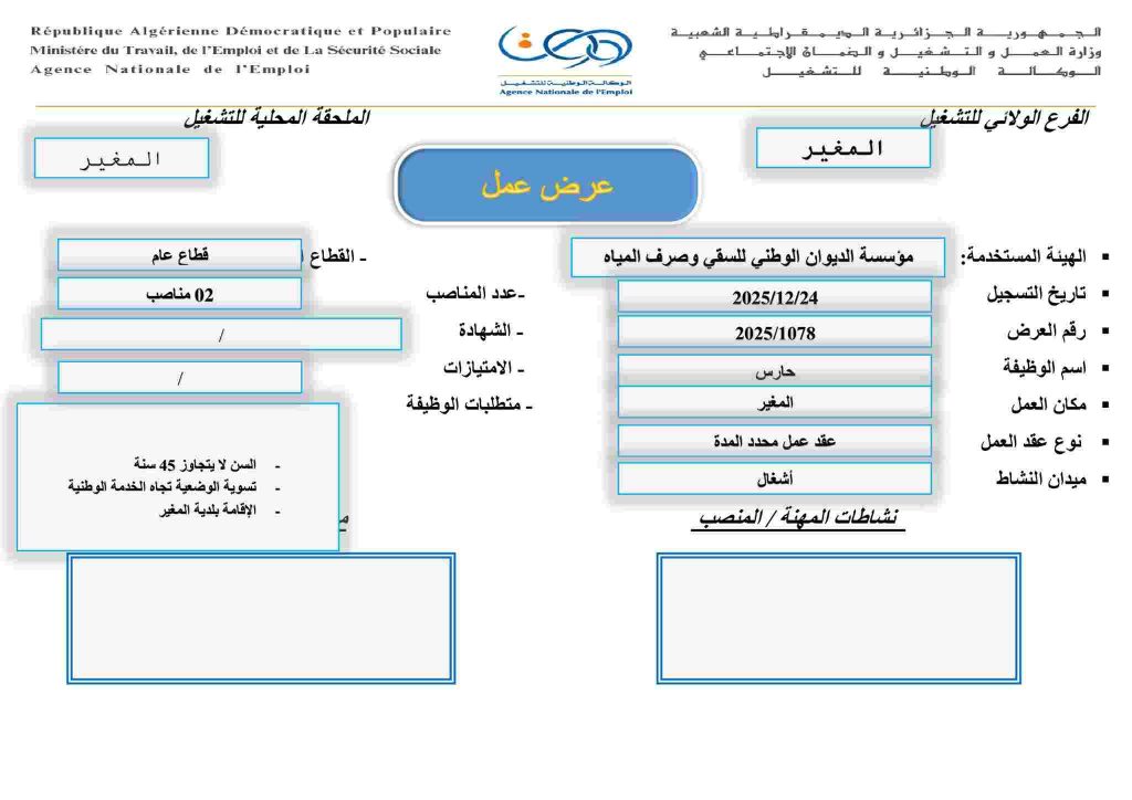 | حارس | 2025/1078 | 02 مناصب | / | المغير | الإقامة ببلدية المغير |