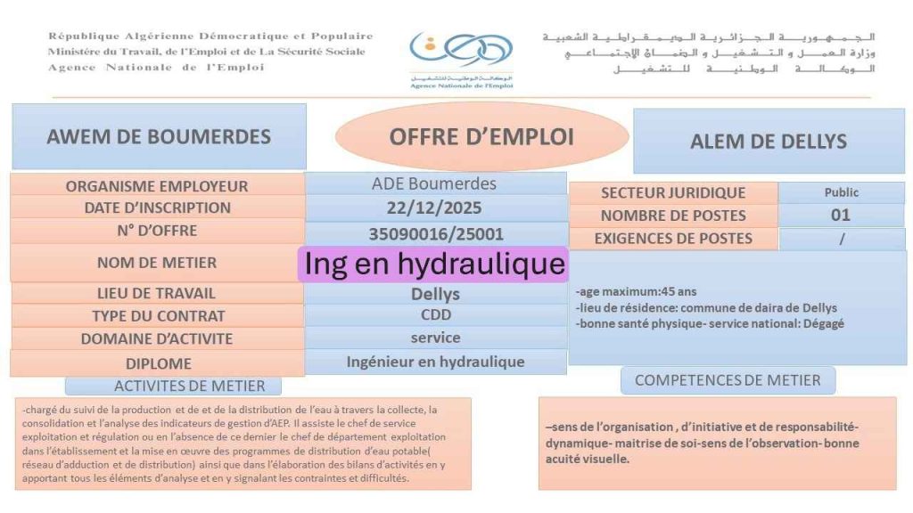 الهيئة المستخدمة: ADE Boumerdes (الجزائرية للمياه – بومرداس).