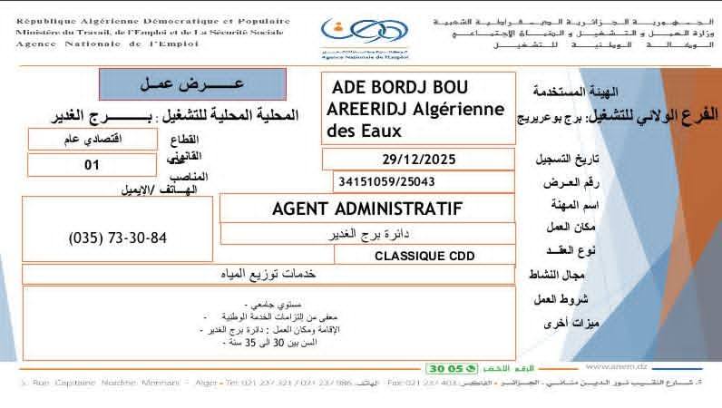 الهيئة المستخدمة: ADE BORDJ BOU ARRERIDJ Algérienne des Eaux