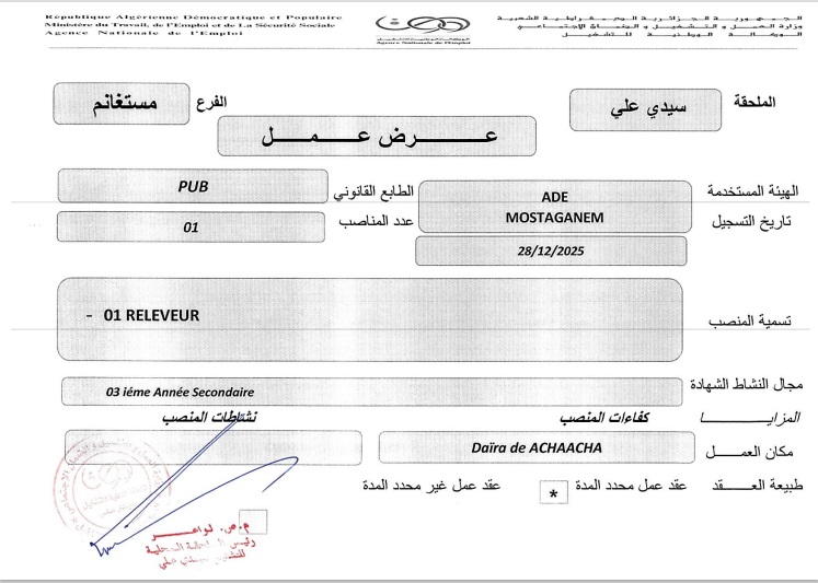 الهيئة المستخدمة: ADE MOSTAGANEM (الجزائرية للمياه – مستغانم)
