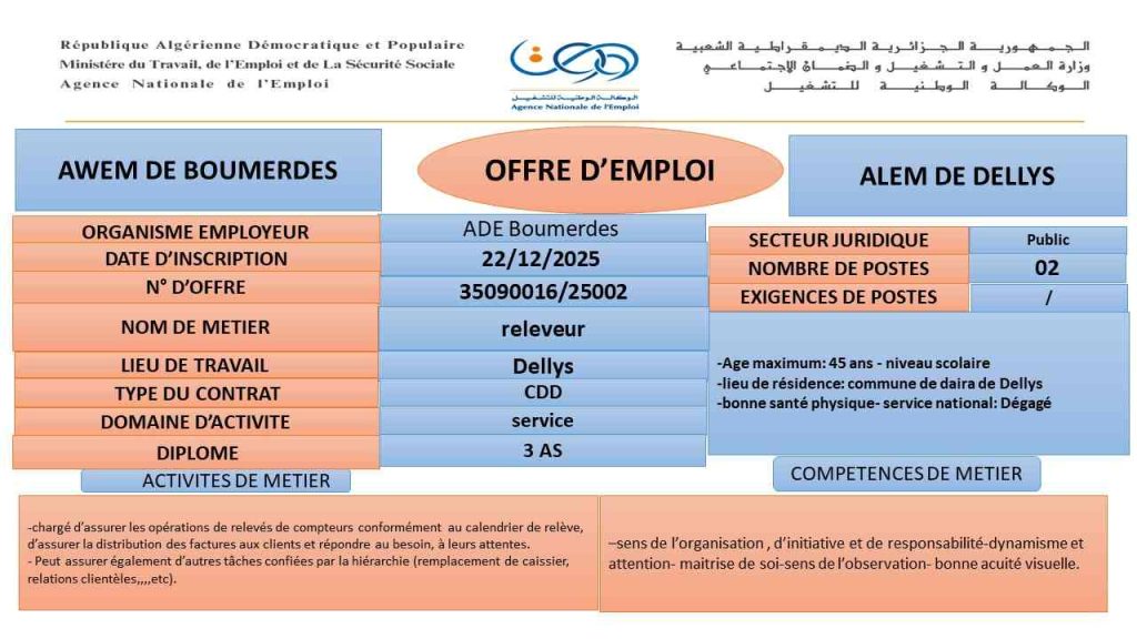 الهيئة المستخدمة: ADE Boumerdes (الجزائرية للمياه – بومرداس).