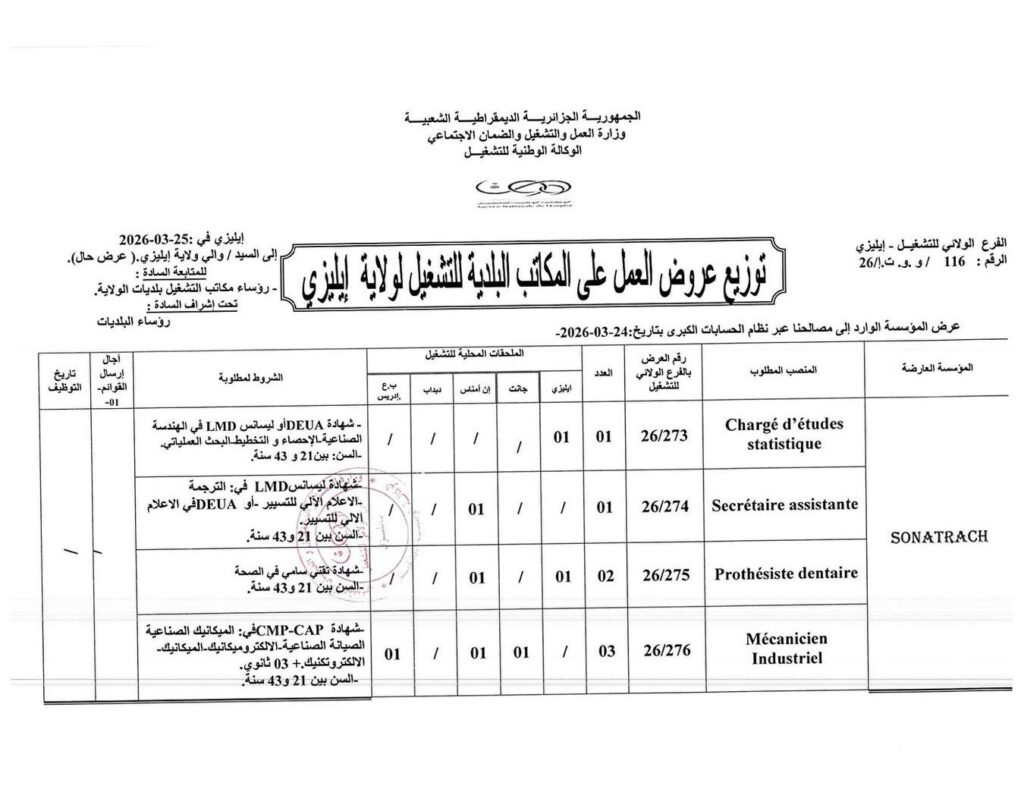 الموضوع: توزيع عروض العمل على المكاتب البلدية للتشغيل لولاية إيليزي (عرض حال).