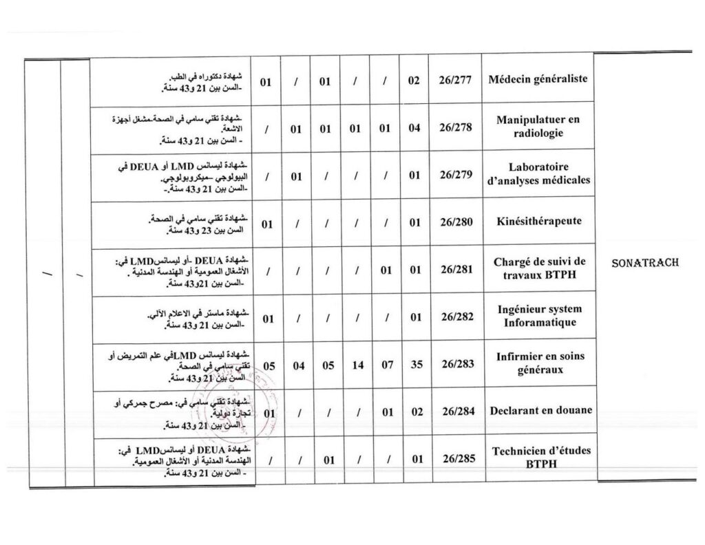 | 26/283 | Infirmier en soins généraux | شهادة ليسانس LMD في علم التمريض أو تقني سامي في الصحة. | 35 |