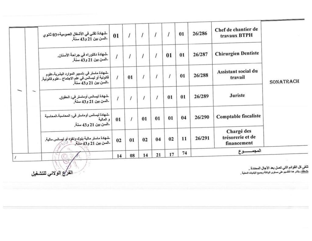 | 26/288 | Assistant social du travail | شهادة ماستر في: تسيير الموارد البشرية – علوم قانونية أو ليسانس في علم الاجتماع – علوم قانونية. | 01 |