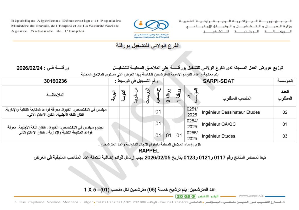 عروض عمل صادرة عن الوكالة الوطنية للتشغيل (ANEM) – الفرع الولائي بورقلة، لصالح شركة SARPI وفروعها، بتاريخ 24 فبراير 2026.