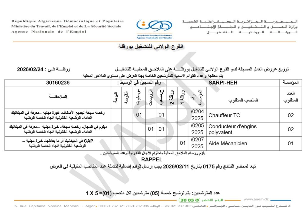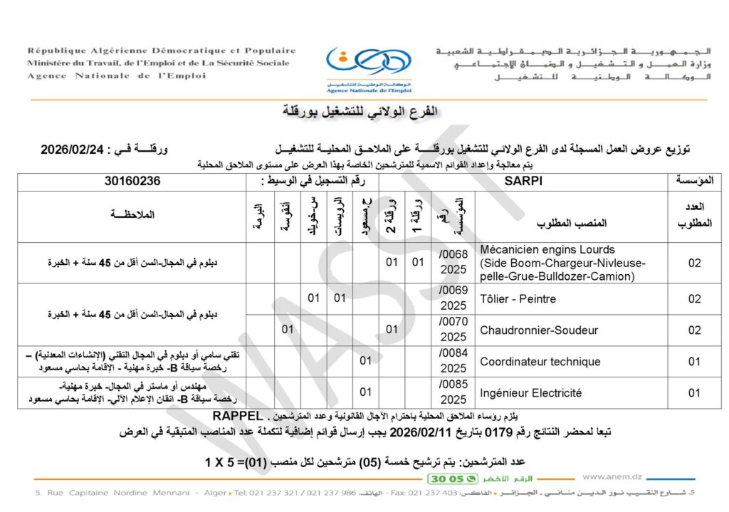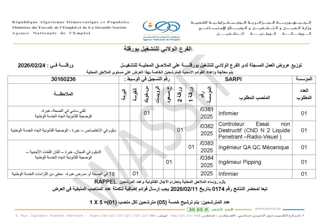عروض عمل صادرة عن الوكالة الوطنية للتشغيل (ANEM) – الفرع الولائي بورقلة، لصالح شركة SARPI وفروعها، بتاريخ 24 فبراير 2026.