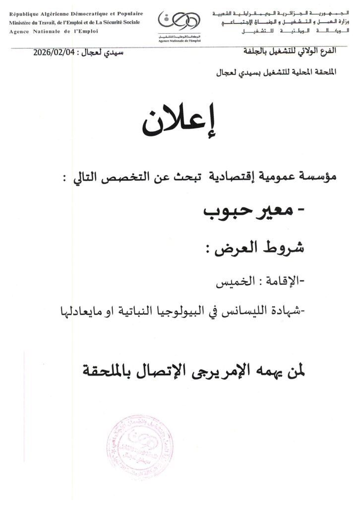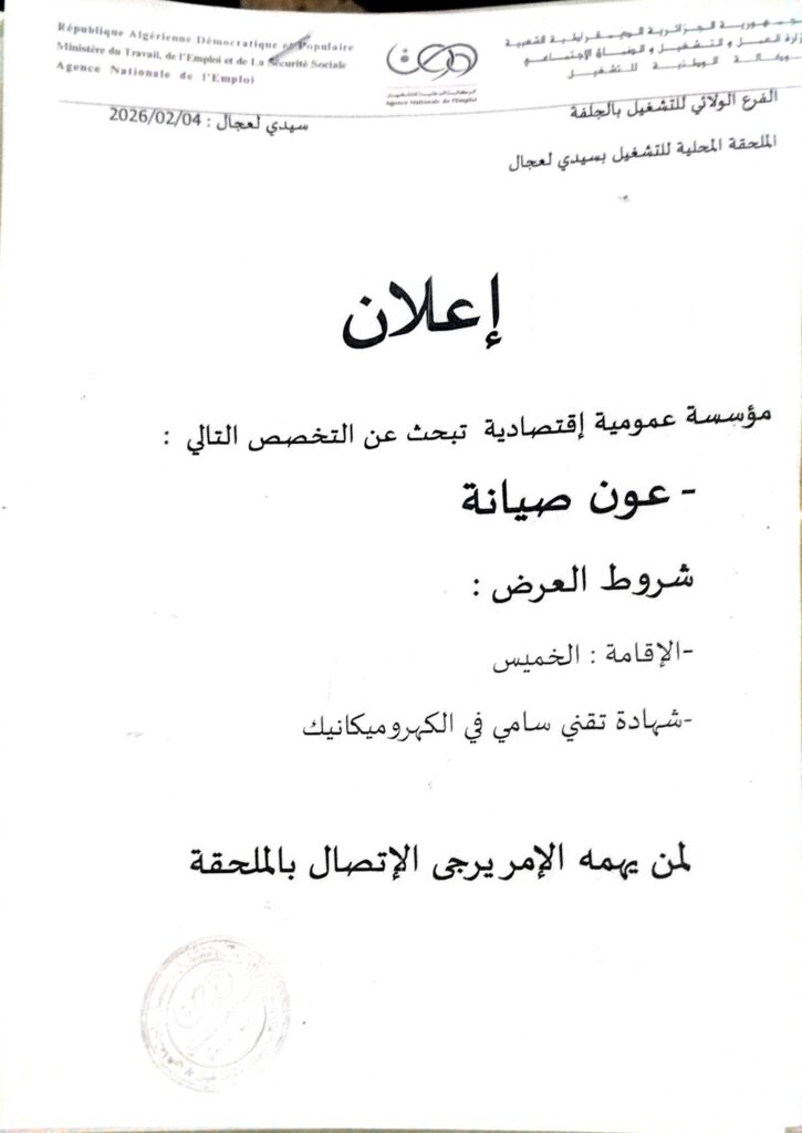 مؤسسة عمومية إقتصادية تبحث عن موظفين في تخصصات مختلفة