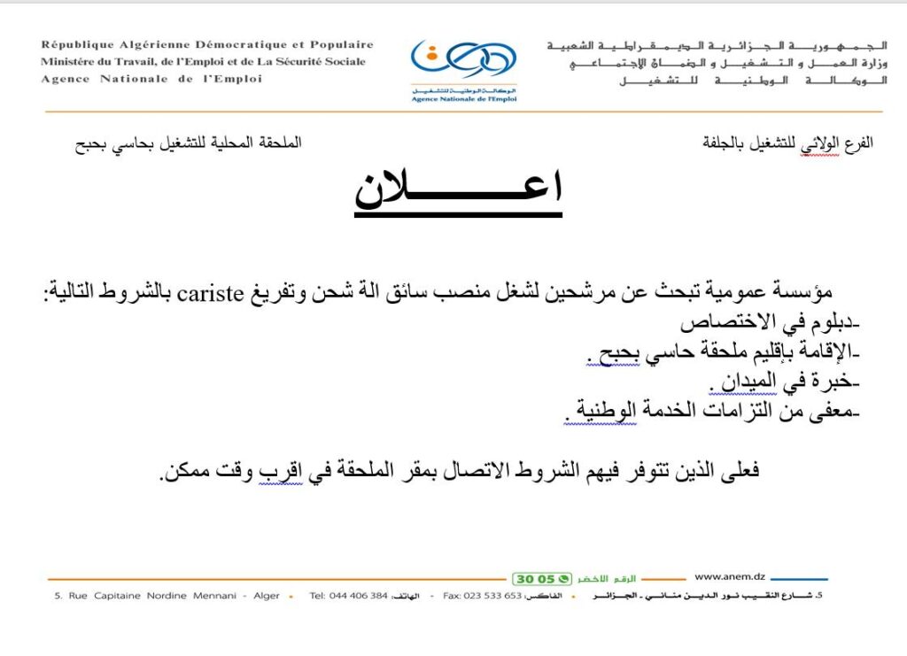 فعلى الراغبين في الترشح ممن تتوفر فيهم الشروط، التوجه في أقرب وقت ممكن إلى مقر الملحقة المحلية للتشغيل بحاسي بحبح.