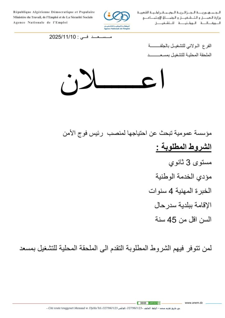 على الراغبين في الترشح والذين تتوفر فيهم الشروط المطلوبة، التقدم إلى:الملحقة المحلية للتشغيل بمسعد – ولاية الجلفة