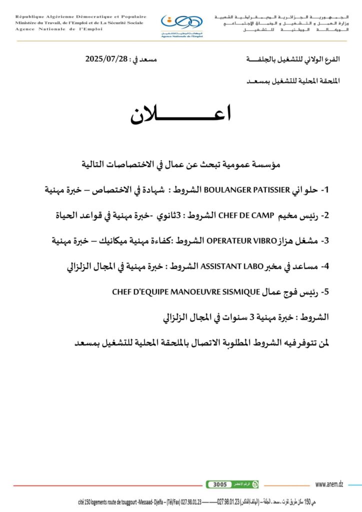 على الراغبين في الترشح والذين تتوفر فيهم الشروط المطلوبة، التوجه إلى: الملحقة المحلية للتشغيل بمسعد – ولاية الجلفة