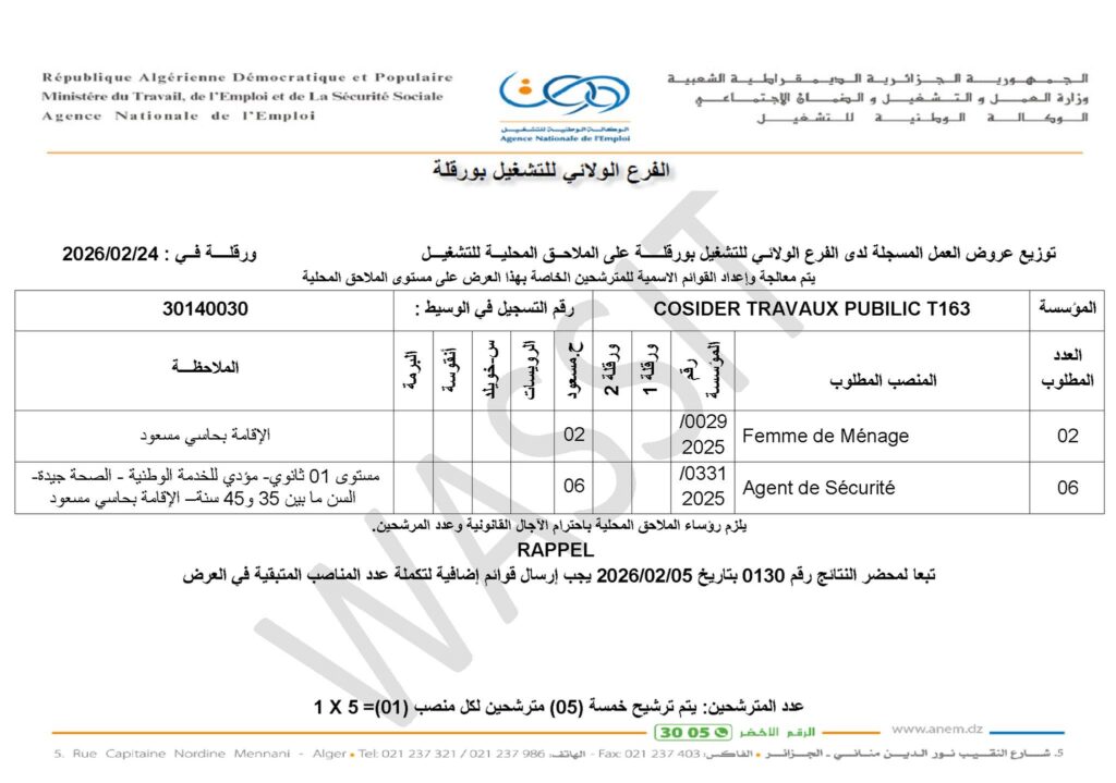 تبعا لمحضر النتائج رقم 0130 بتاريخ 05 / 02 / 2026 يجب إرسال قوائم إضافية لتكملة عدد المناصب المتبقية في العرض.