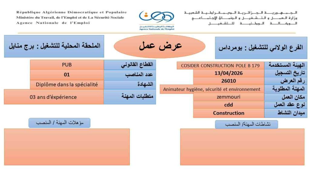 Animateur hygiène, sécurité et environnement 01 Diplôme dans la spécialité 03 ans d’expérience
