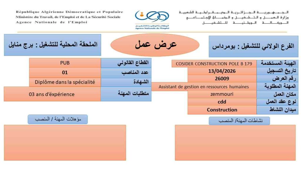 Assistant de gestion en ressources humaines 01 Diplôme dans la spécialité 03 ans d’expérience
