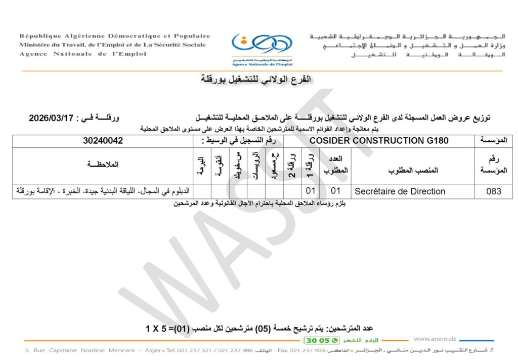 | Secrétaire de Direction | 083 | 02 | الدبلوم في المجال – اللياقة البدنية جيدة – الخبرة – الإقامة بورقلة. |