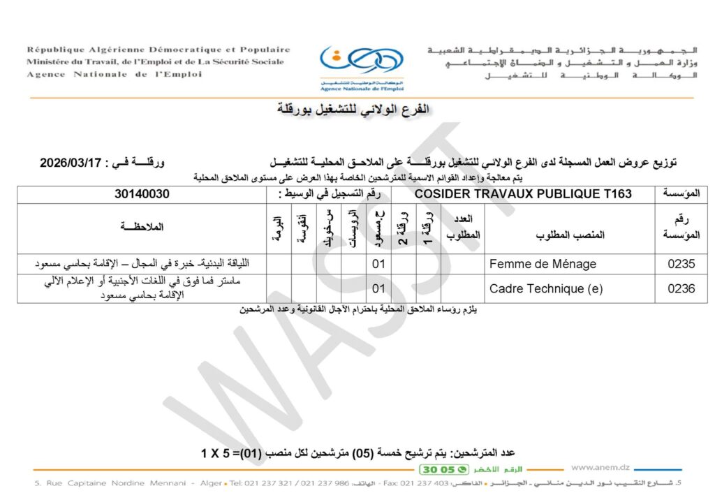 الإعلان الثاني: COSIDER TRAVAUX PUBLIQUE T163