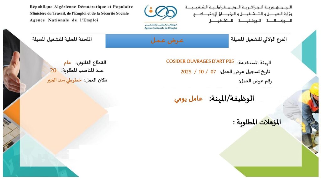 عرض عمل من COSIDER OUVRAGES D’ART P05 (الملحقة المحلية للتشغيل بالمسيلة)