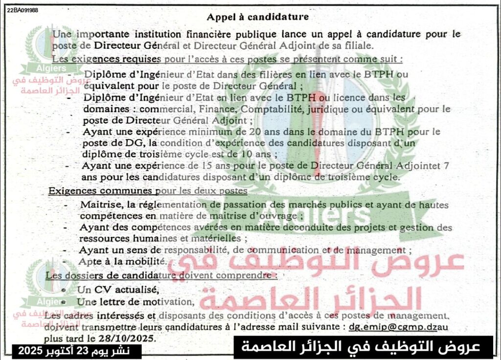 مؤسسة مالية عمومية هامة تعلن عن فتح باب الترشح لشغل مناصب عالية
