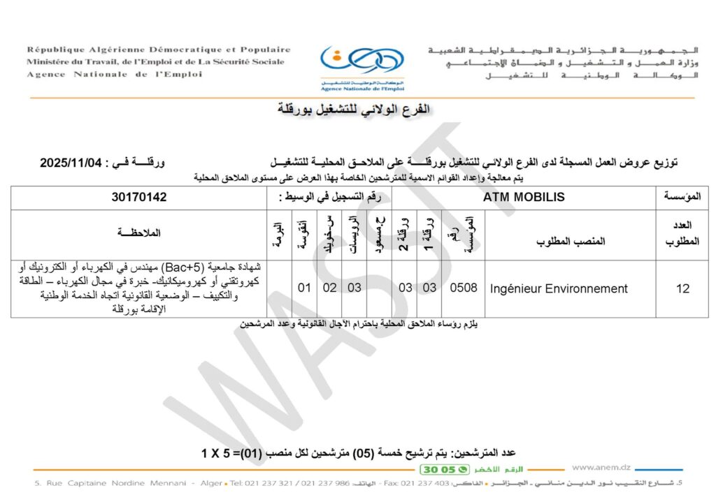 | 0508 | مهندس بيئة (Ingénieur Environnement) | 03 | البرمة – أنقوسة – س. خويلد – الرويسات – حاسي مسعود – ورقلة 1 و2 | شهادة جامعية (5 سنوات) في الكهرباء، الإلكترونيات، الكهروتقني أو الكهروميكانيك – خبرة في مجال الكهرباء والطاقة والتكييف – الوضعية القانونية اتجاه الخدمة الوطنية – الإقامة بورقلة |