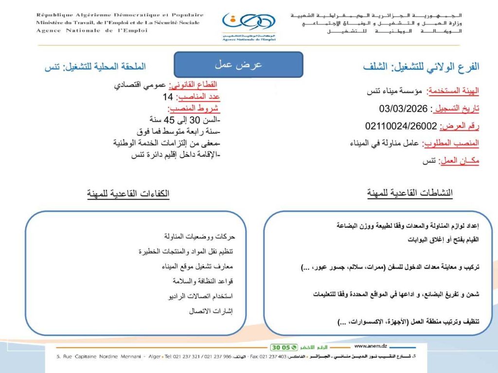مؤسسة ميناء تنس تعلن عن فتح توظيف عمال مناولة