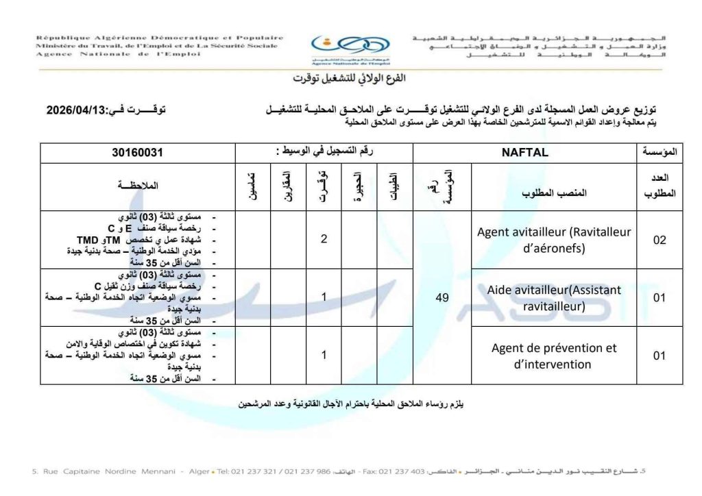 لقد قمت باستخراج المعلومات الأساسية والبيانات الواردة في الصور المرفقة، وهي عبارة عن إعلانات توظيف لشركة Naftal عبر الوكالة الوطنية للتشغيل (ANEM) في الجزائر.