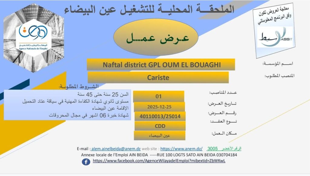 تعلن الملحقة المحلية للتشغيل عين البيضاء عن عرض عمل رسمي لفائدة مؤسسة Naftal district GPL OUM EL BOUAGHI، وذلك في إطار عقود محددة المدة (CDD)، موجَّه للباحثين عن عمل بولاية أم البواقي، خاصة في مجال المحروقات والنقل.
