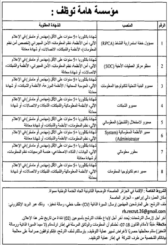 | 6 | مسير الأنظمة المعلوماتية (System Administrator) | شهادة بكالوريا + 5 سنوات على الأقل (مهندس أو ماستر) في الإعلام الآلي، نظم المعلومات، الأنظمة والشبكات، أو شهادة معادلة. |