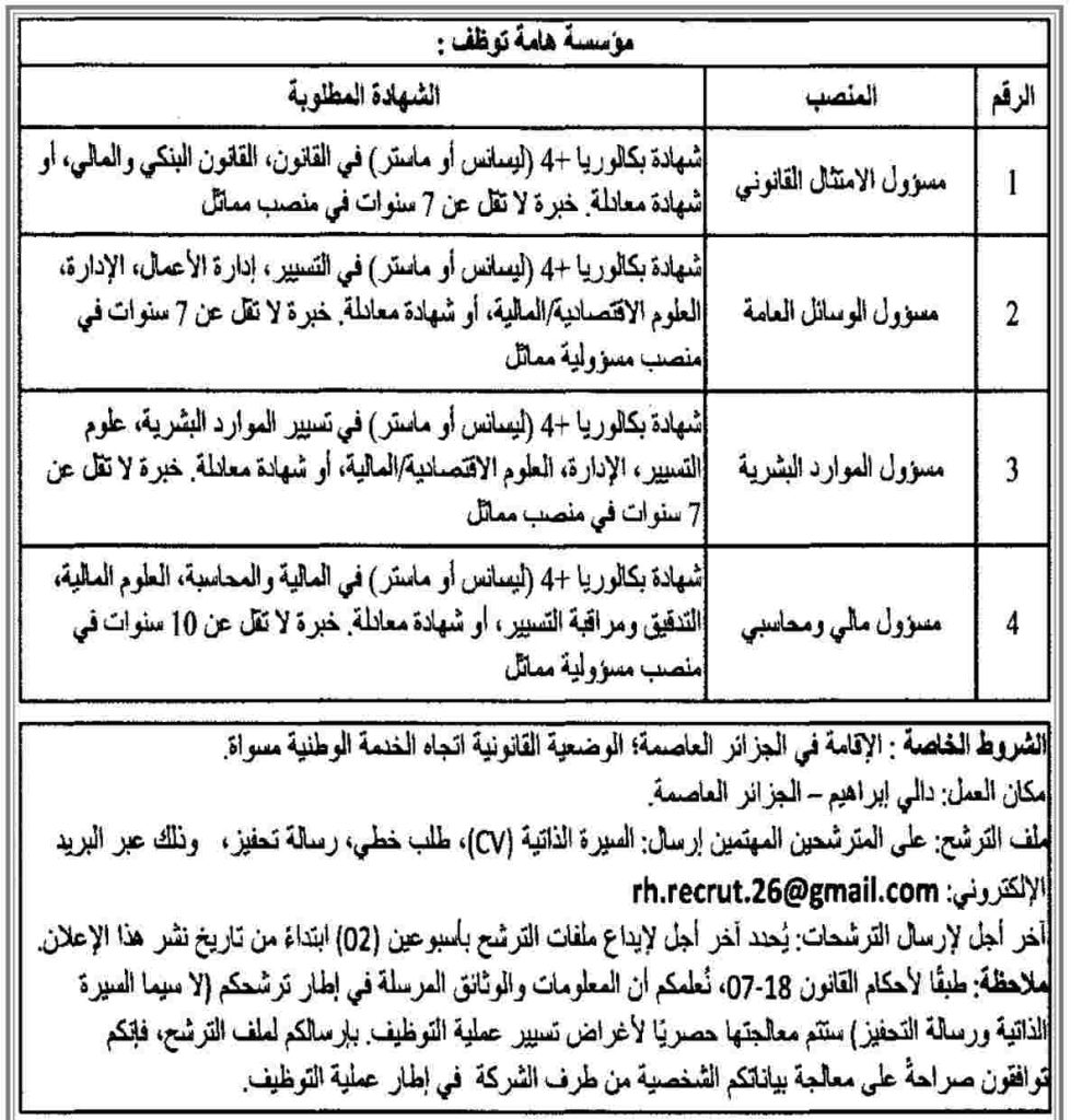 | 2 | مسؤول الوسائل العامة | شهادة بكالوريا +4 (ليسانس أو ماستر) في التسيير، إدارة الأعمال، الإدارة، العلوم الاقتصادية/المالية، أو شهادة معادلة. خبرة لا تقل عن 7 سنوات في منصب مسؤولية مماثل |