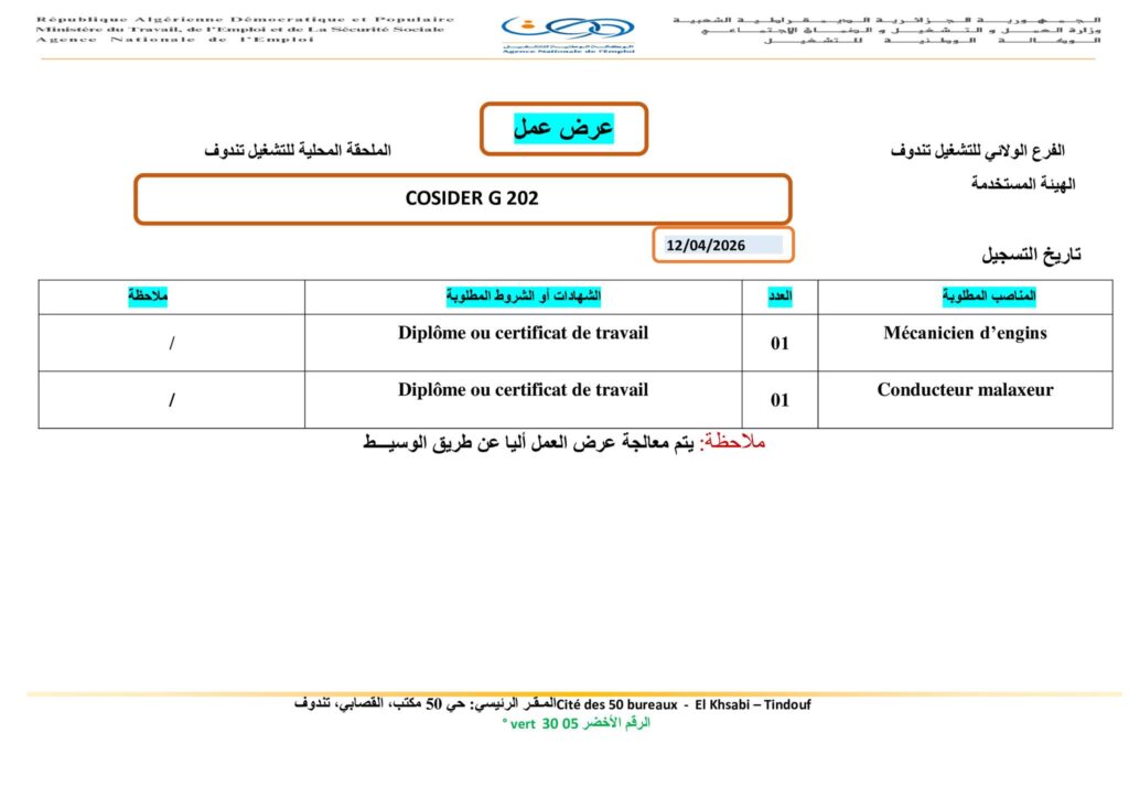 | Mécanicien d’engins (ميكانيكي آليات) | 01 | دبلوم أو شهادة عمل (Diplôme ou certificat de travail) |