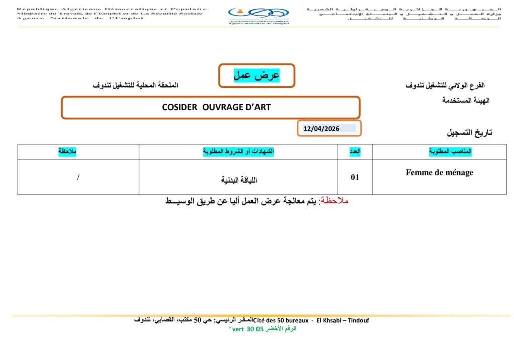 | Femme de ménage (عاملة نظافة) | 01 | اللياقة البدنية |