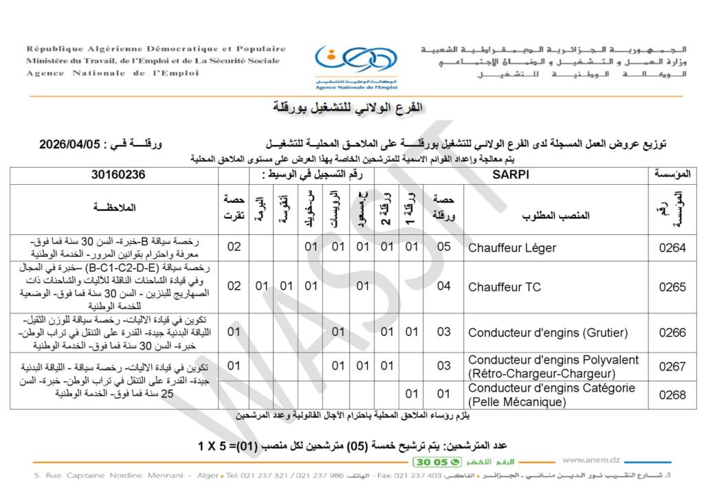 | 0264 | Chauffeur Léger | 05 | ورقلة 1 (01)، ورقلة 2 (01)، ح. مسعود (01)، الرويسات (01)، س. خويلد (01)، تقرت (02) | رخصة سياقة صنف B – خبرة – السن 30 سنة فما فوق – معرفة واحترام قوانين المرور – الخدمة الوطنية. |