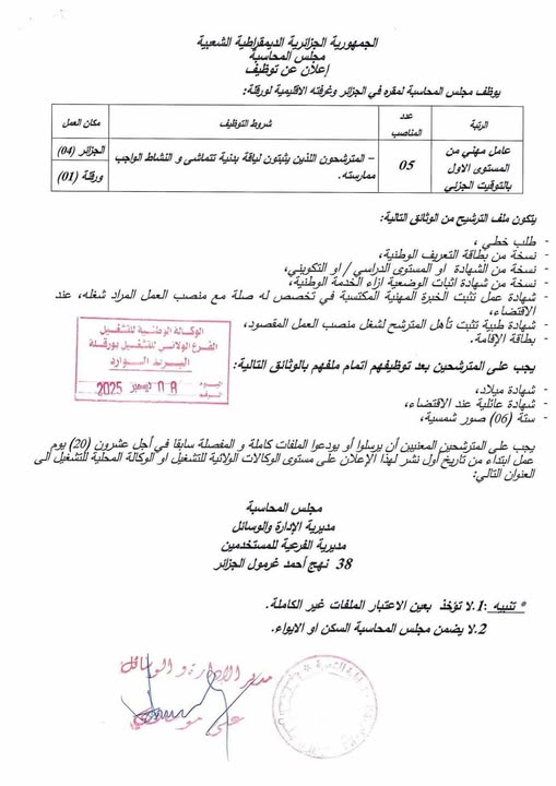 يعلن مجلس المحاسبة عن فتح مسابقة توظيف لمقره بالجزائر وغرفته الإقليمية بورقلة، وذلك في الرتبة المبينة أدناه: