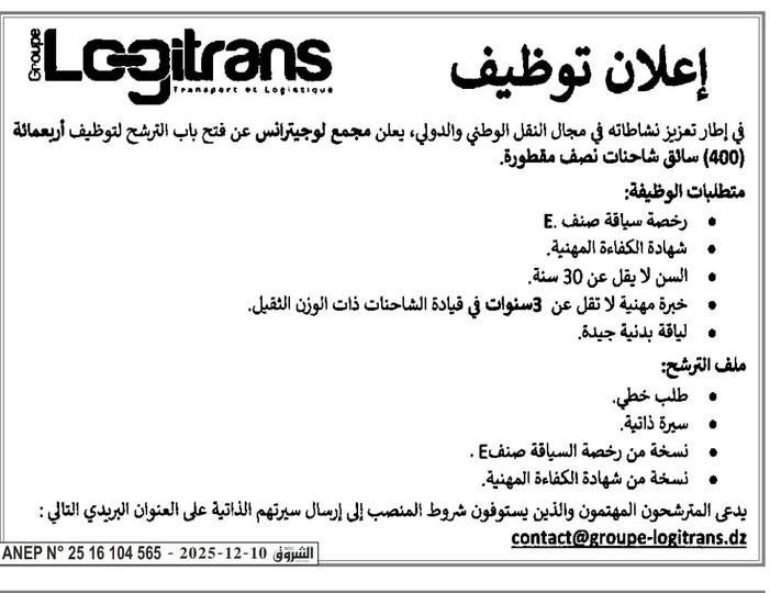 في إطار تعزيز نشاطاته في مجال النقل الوطني والدولي، يعلن مجمع لوجيترانس عن فتح باب الترشح لتوظيف: