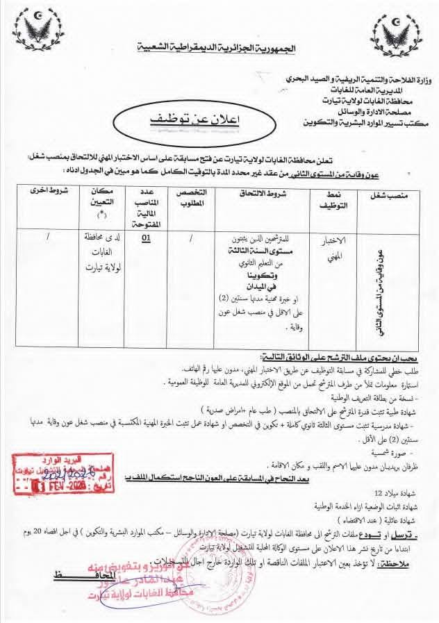 تعلن محافظة الغابات لولاية تيارت عن فتح مسابقة على أساس الاختبار المهني للالتحاق بمنصب شغل: