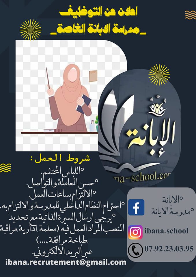 مدرسة الإبانة الخاصة تعلن عن احتياجتها لمعلمين.ادارية.طباخة.مراقبة.مرافقة