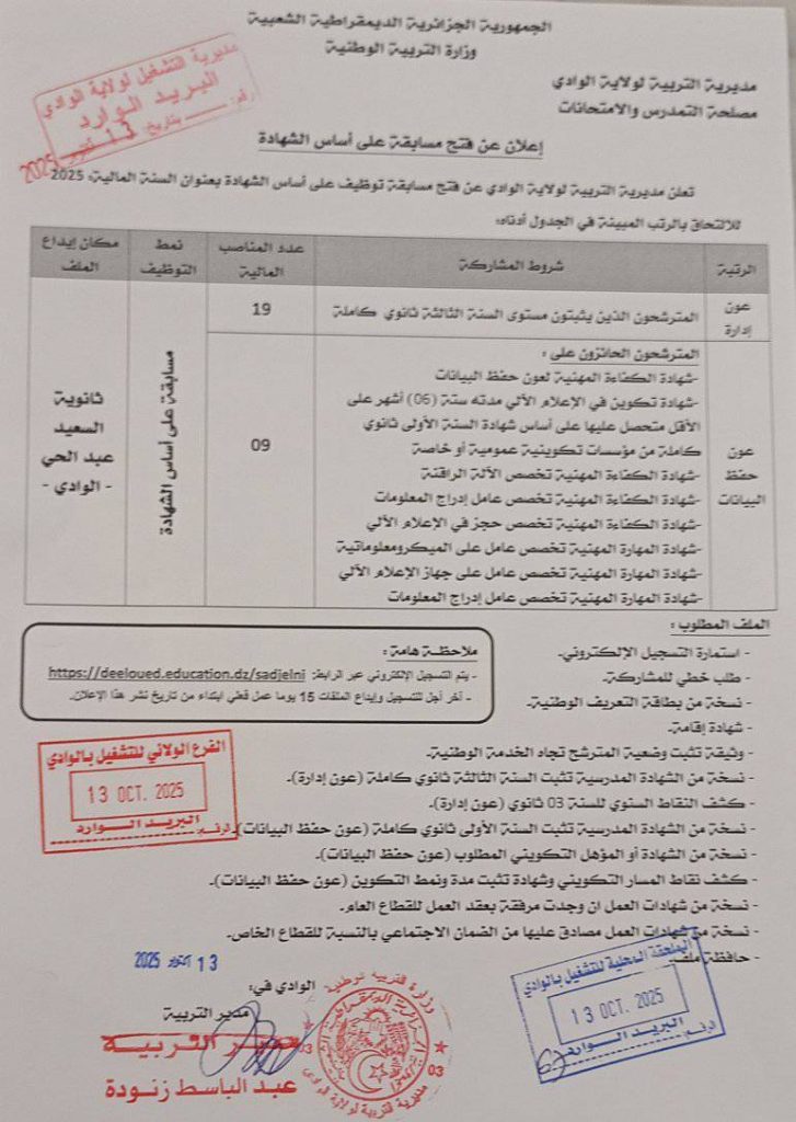 بناءً على مراسلة مديرية التشغيل لولاية الوادي، تعلن مديرية التربية لولاية الوادي عن فتح مسابقة توظيف على أساس الشهادة بعنوان السنة المالية 2025، للالتحاق بالرتب المبينة في الجدول أدناه: