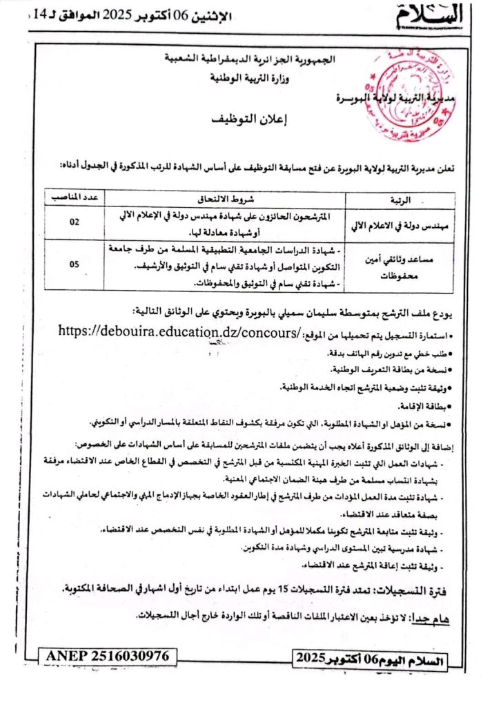 يُعلن السيد مدير التربية لولاية البويرة عن فتح مسابقة توظيف على أساس الشهادة بعنوان السنة المالية 2025، للالتحاق بالرتب التالية: