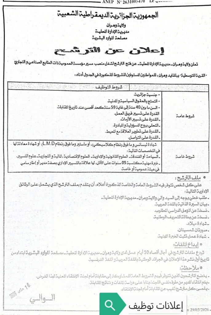 تعلن ولاية وهران – مديرية الإدارة المحلية – عن فتح الترشح لشغل منصب مسير مؤسسة العمومية ذات الطابع الصناعي والتجاري “القرية المتوسطية ببلقايد وهران”، للمواطنين المستوفين للشروط المذكورة في الجدول أدناه: