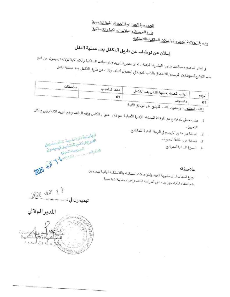 في إطار تدعيم مصالحنا بالموارد البشرية المؤهلة، تعلن مديرية البريد والمواصلات السلكية واللاسلكية لولاية تيميمون عن فتح باب الترشح للموظفين المرسمين للالتحاق بالرتب المدونة في الجدول أدناه، وذلك عن طريق التكفل بعد عملية النقل
