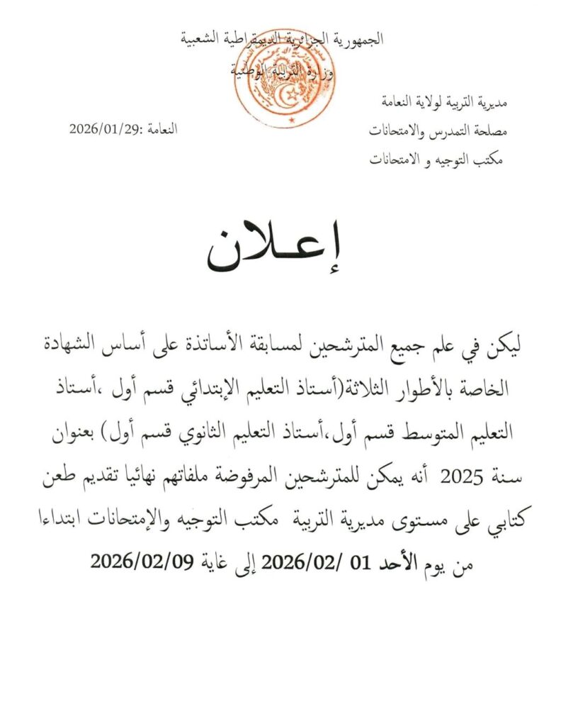 بعنوان سنة 2025، أنه يمكن للمترشحين الذين رُفضت ملفاتهم نهائيًا، تقديم طعن كتابي على مستوى مديرية التربية – مكتب التوجيه والامتحانات، وذلك ابتداءً من:
