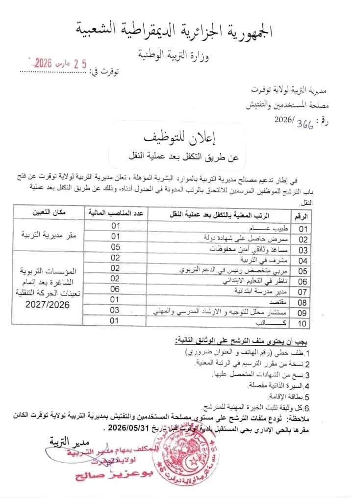في إطار تدعيم مصالح مديرية التربية بالموارد البشرية المؤهلة، تعلن مديرية التربية لولاية توقرت عن فتح باب الترشح للموظفين المرسمين للالتحاق بالرتب المدونة في الجدول أدناه، وذلك عن طريق التكفل بعد عملية النقل.