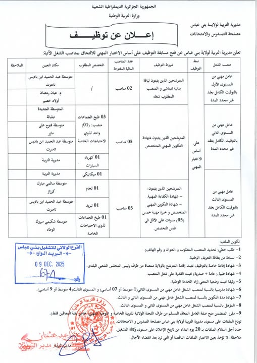 تعلن مديرية التربية لولاية بني عباس عن فتح مسابقة توظيف على أساس الاختبار المهني للالتحاق بمناصب الشغل الآتية: